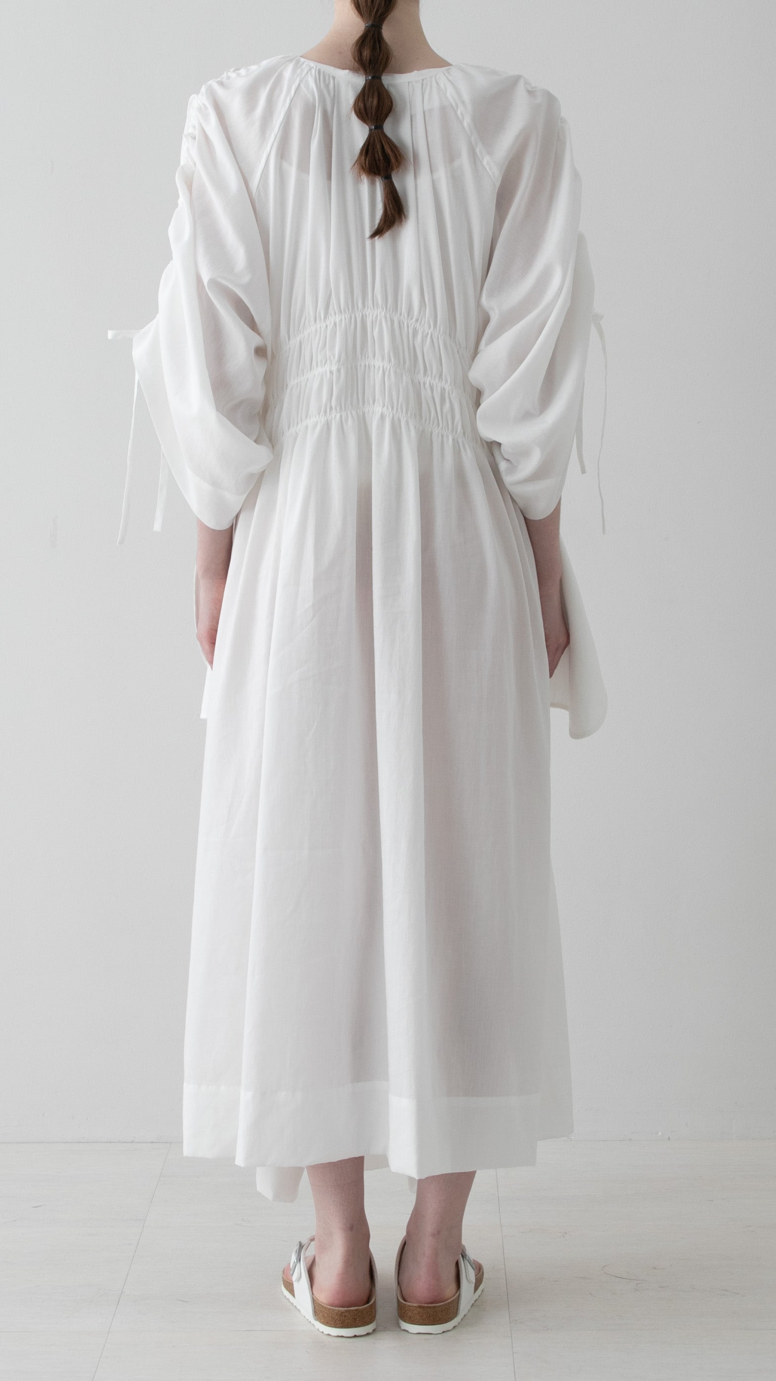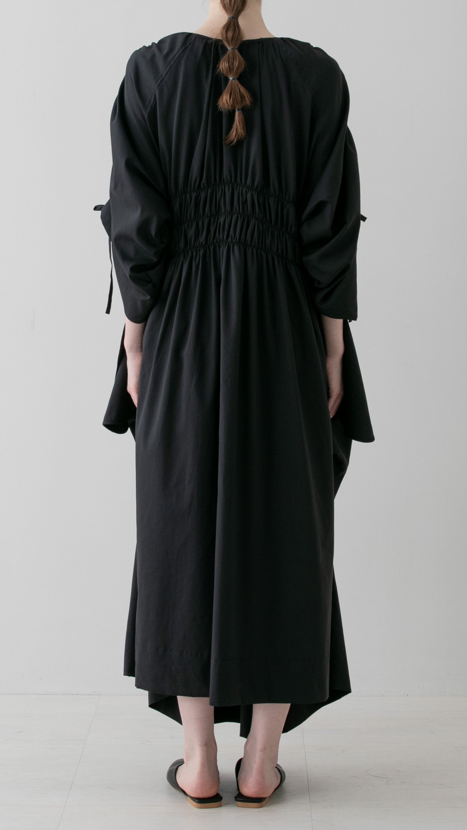 The generous volume of the dress is complemented by three shirrings at the waist for an elegant silhouette. The sleeves and sides feature strings made of the same fabric, and by tightening the drawstrings, you can adjust not only the silhouette but also the length.