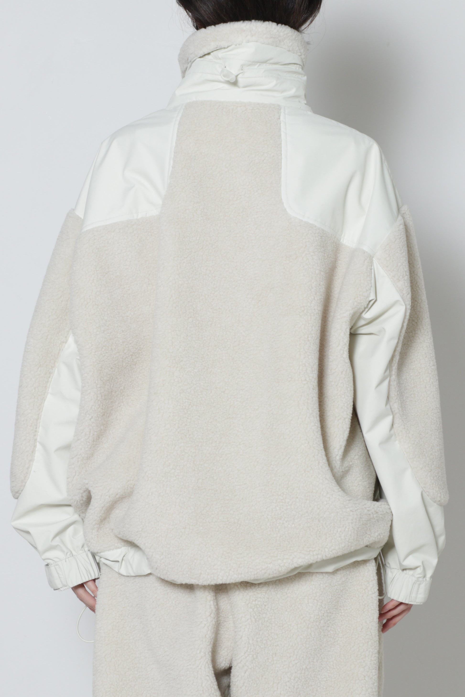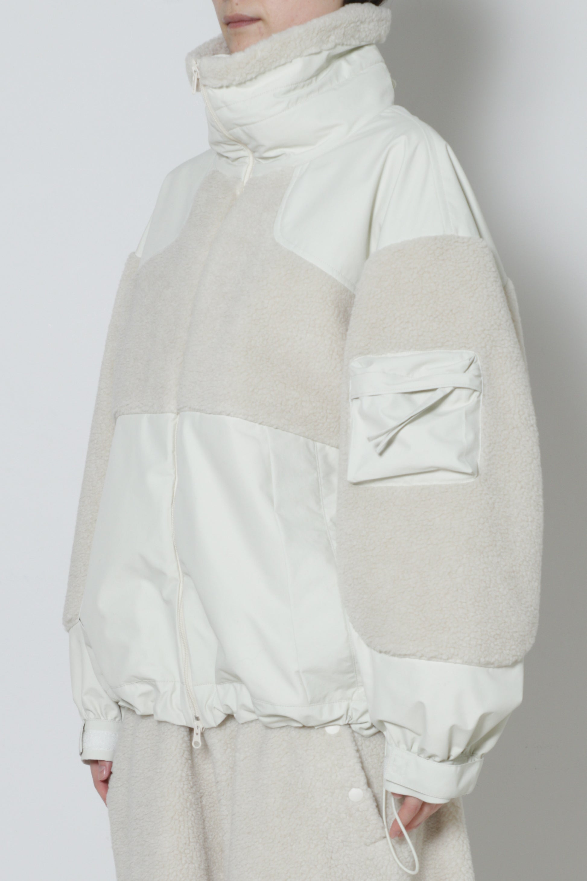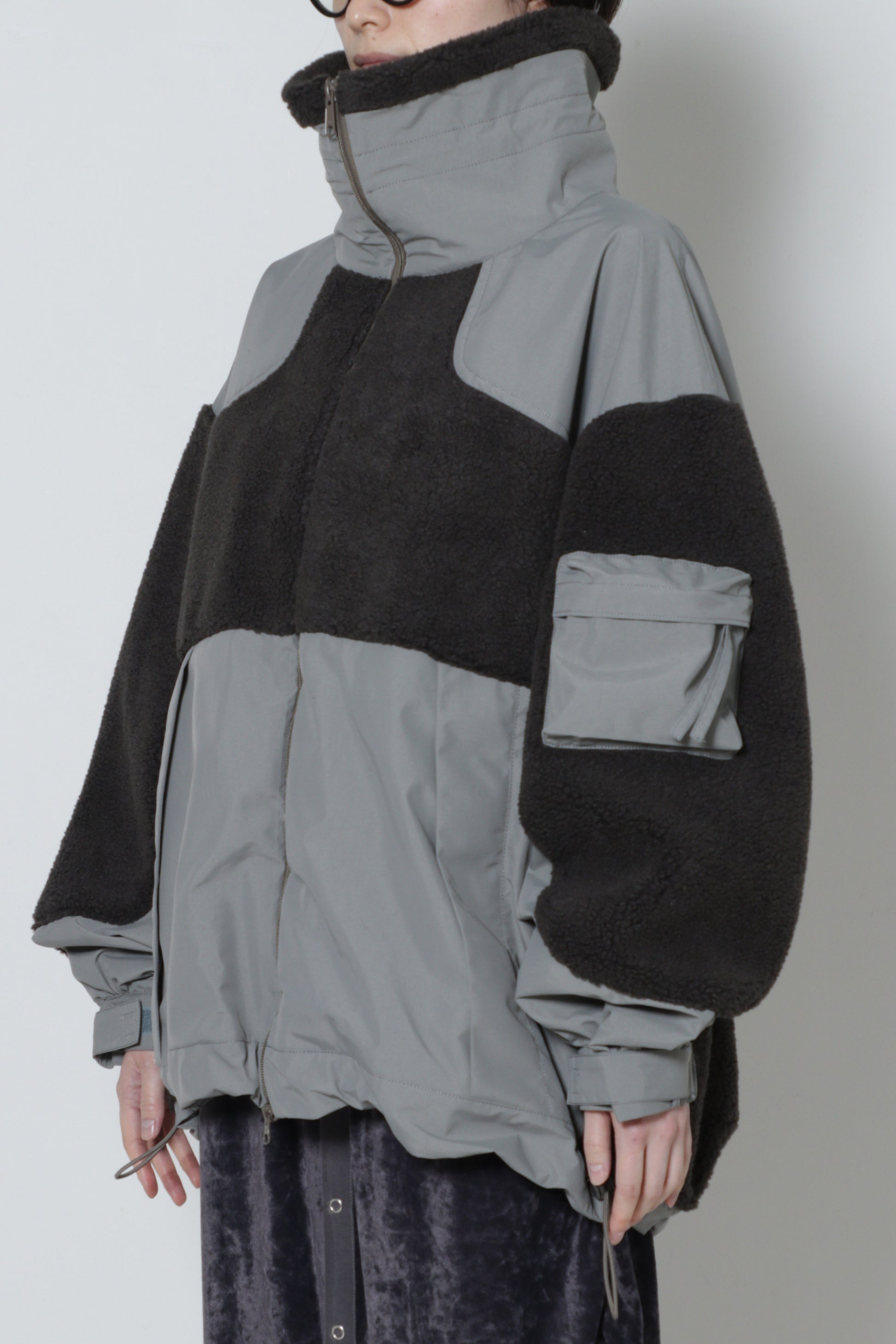 ボア素材とラミネート加工が施されたナイロン素材とのコンビネーションのブルゾンになります。
