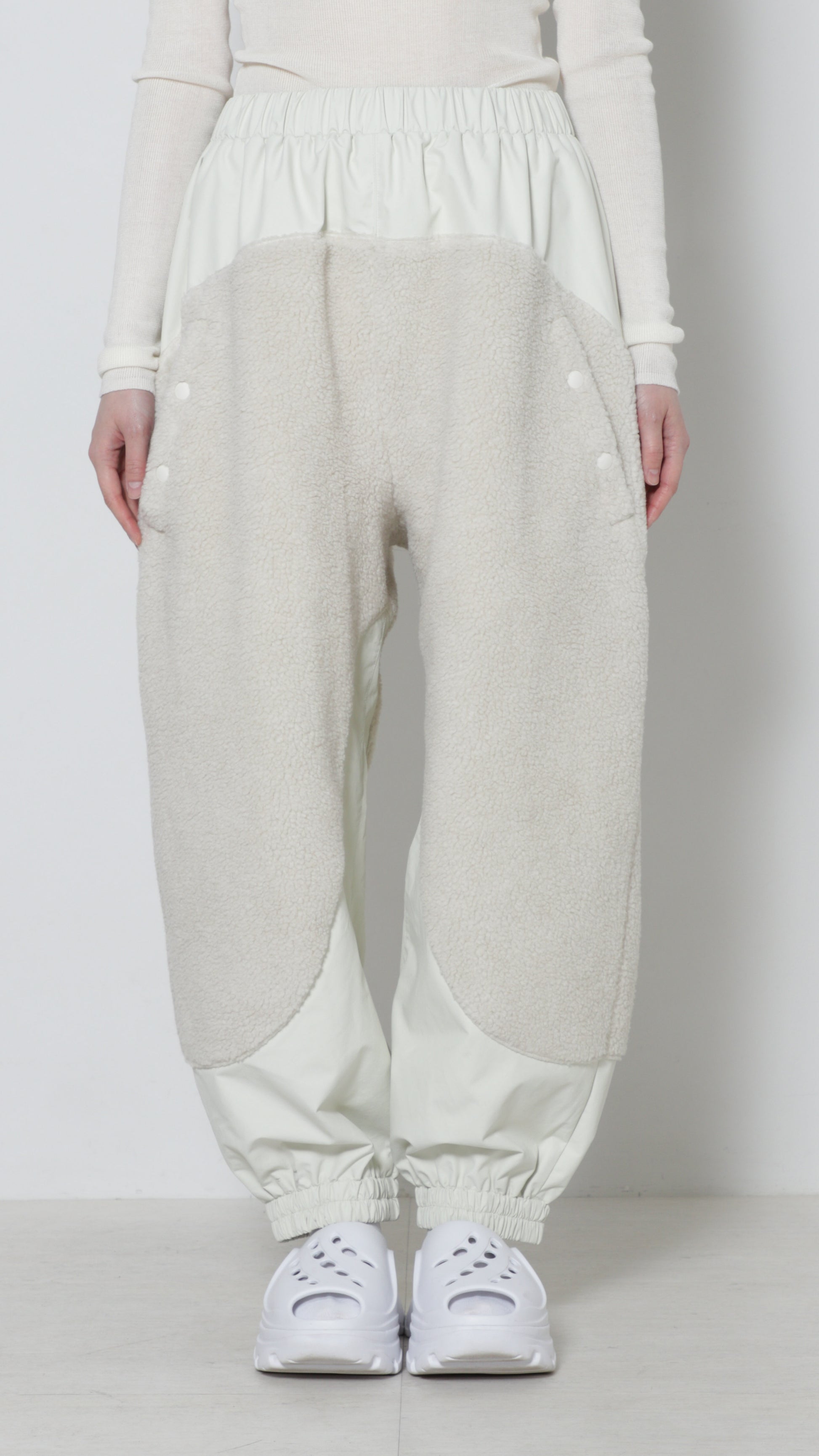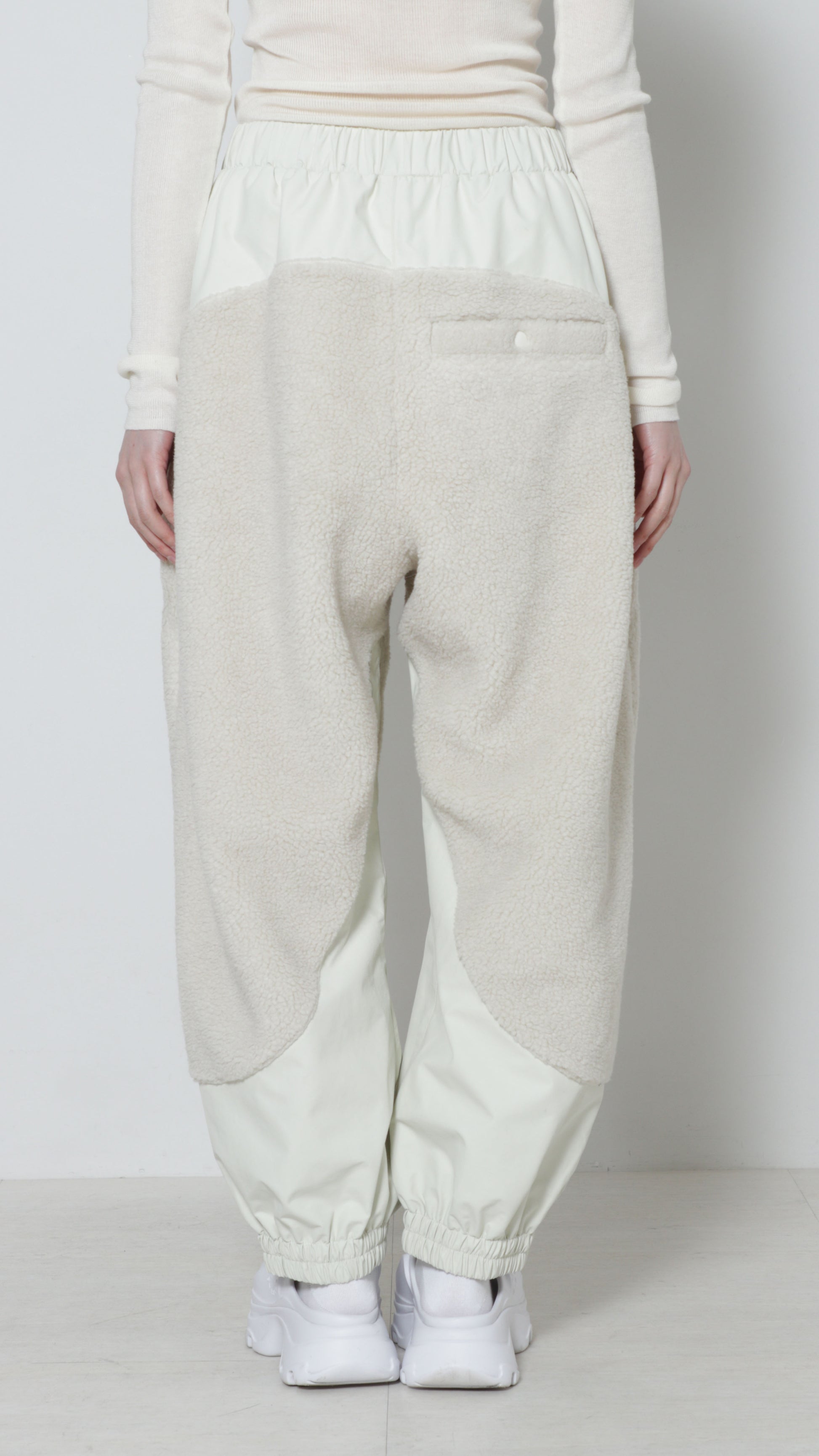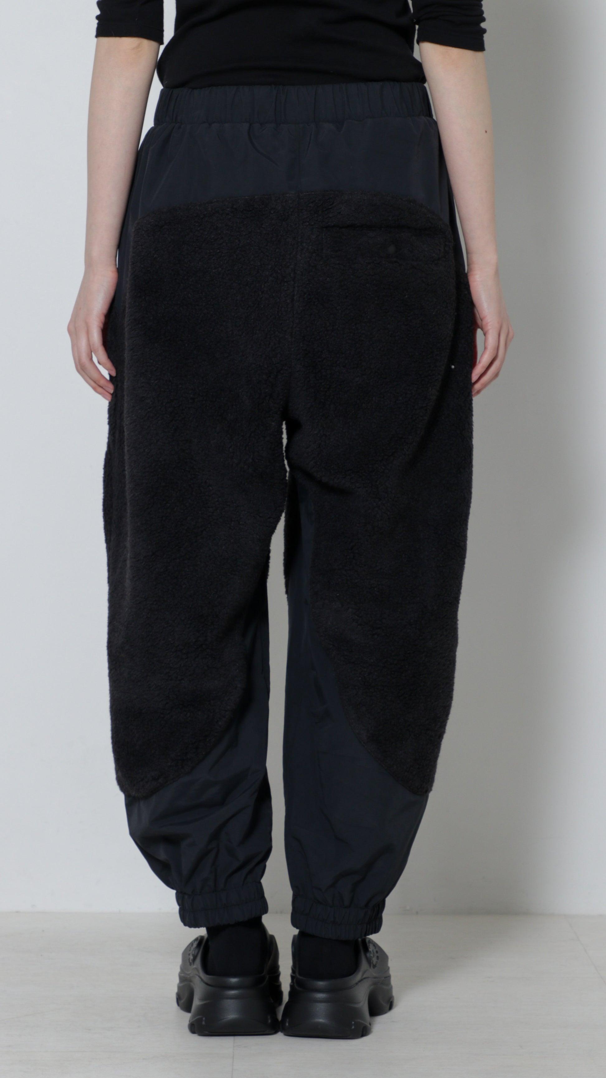 ボア素材とラミネート加工が施されたナイロン素材とのコンビネーションのパンツになります。