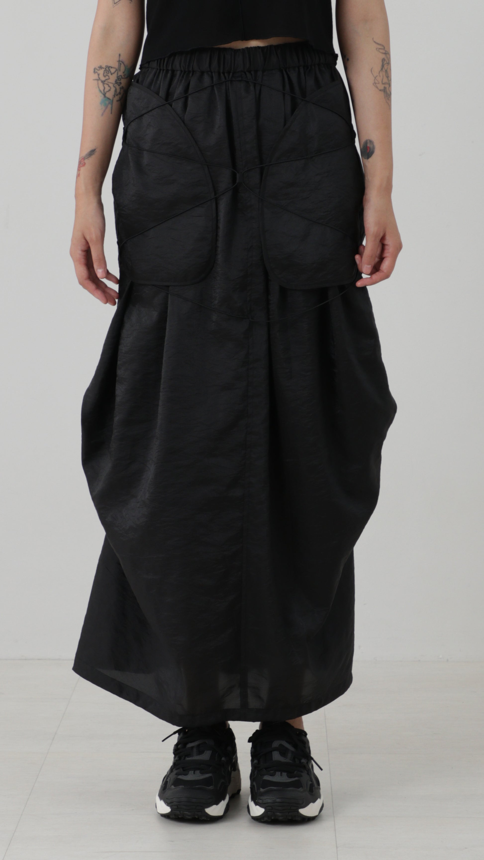 ウエストはゴム仕様で快適な着用感。外側に配されたポケットバッグがデザインのポイントになっています。