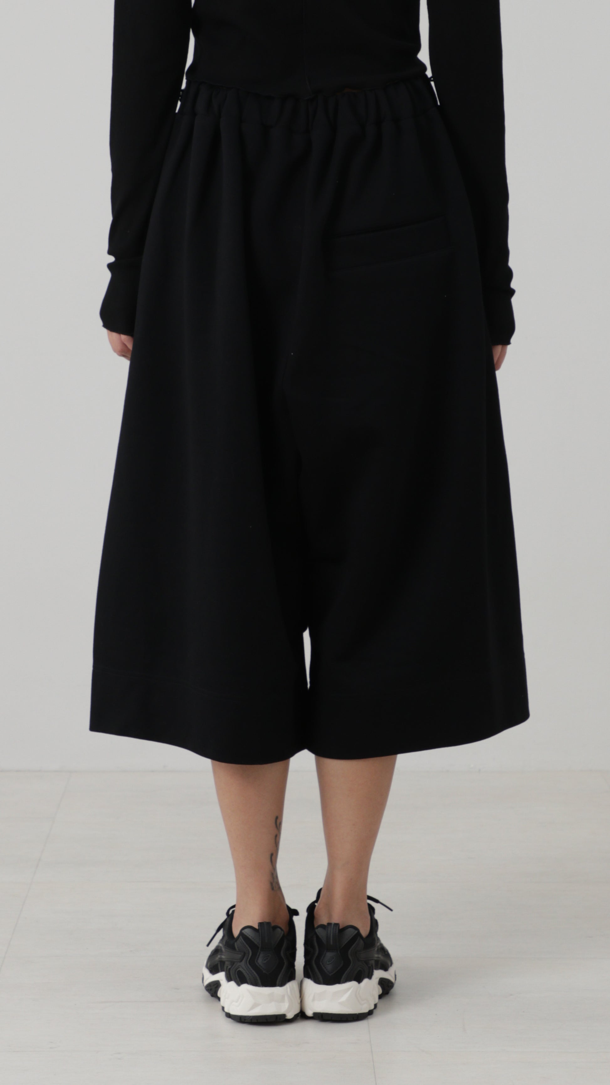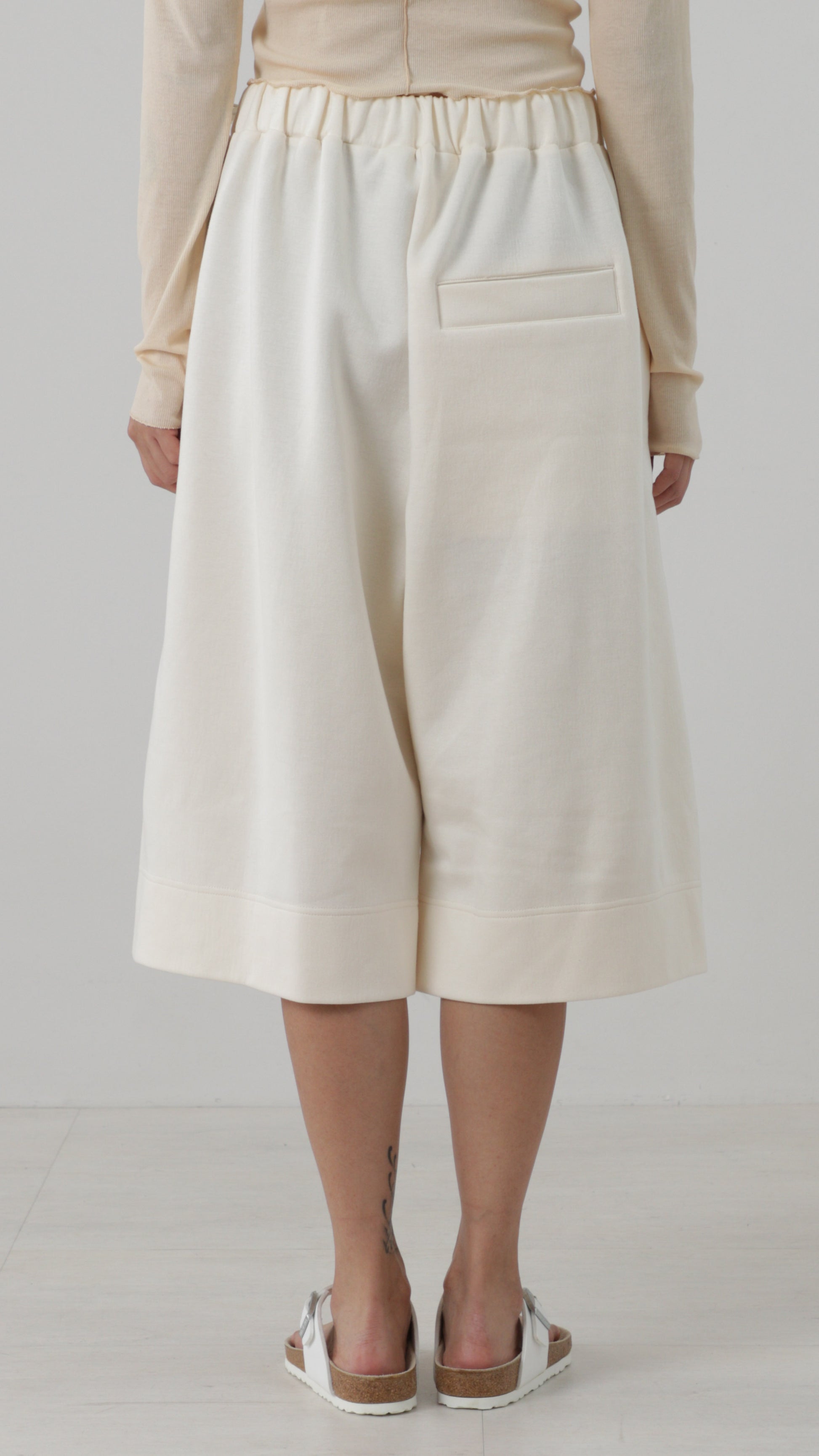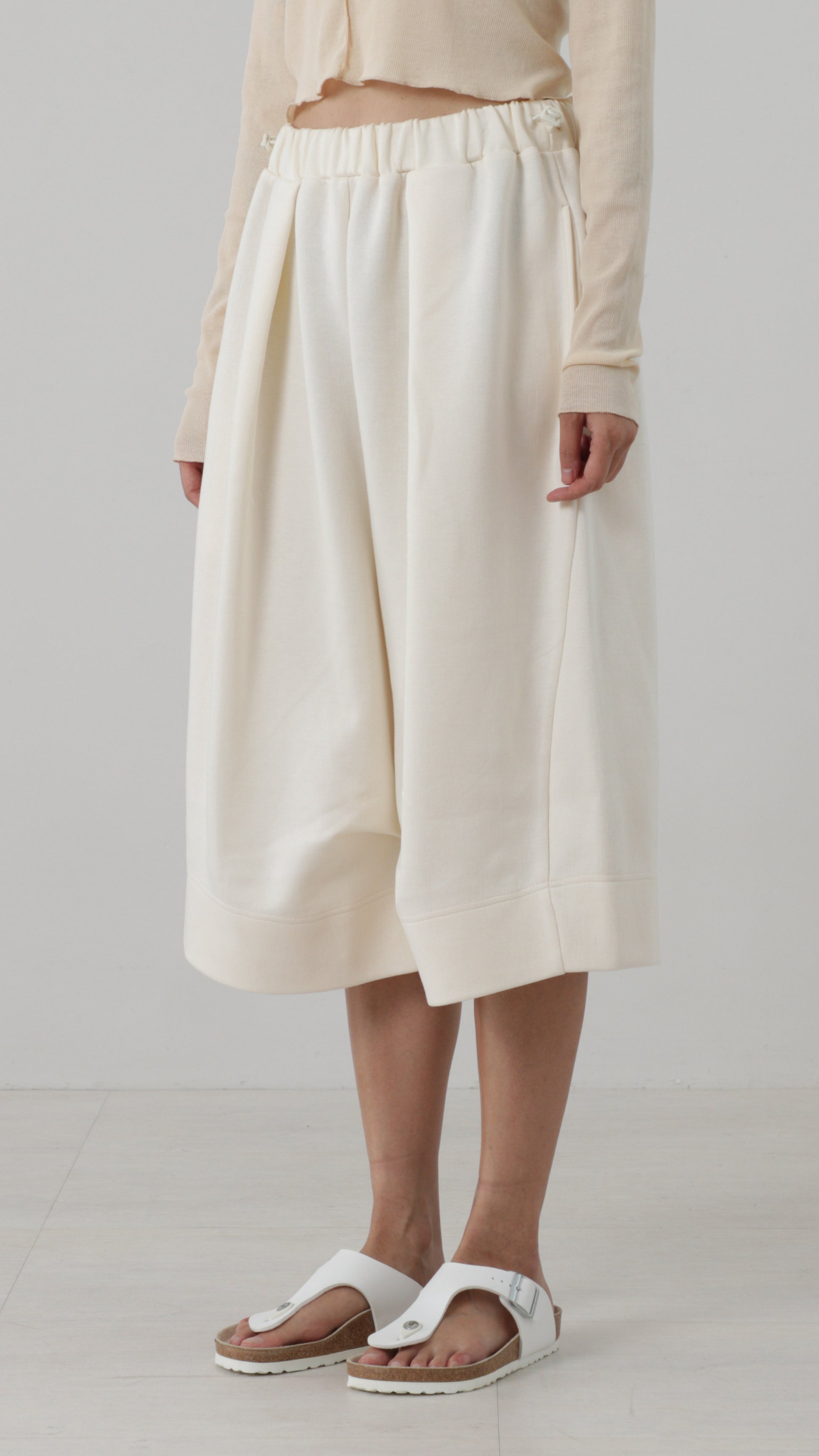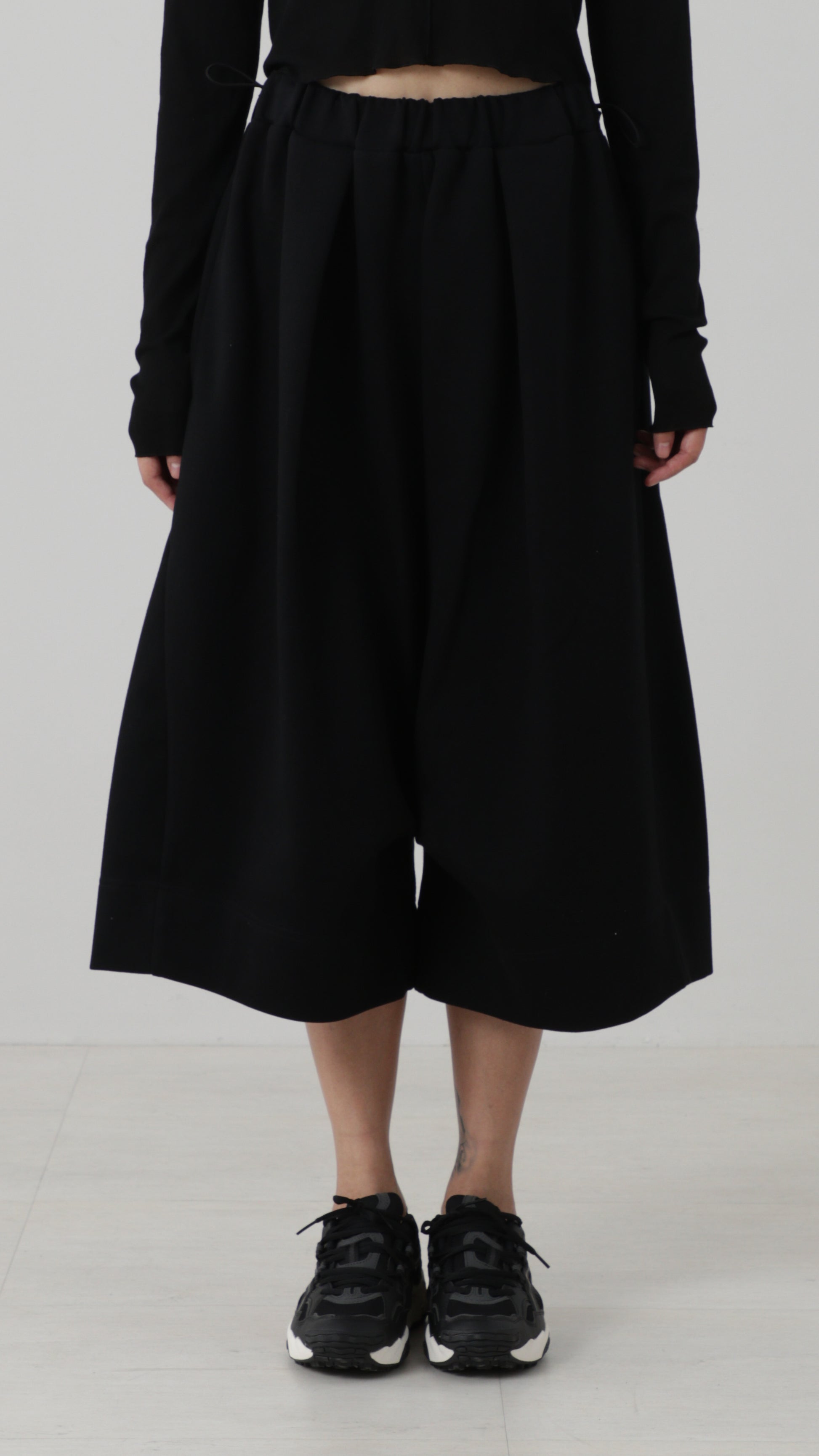 両サイドの切替え位置を大きく前にカーブさせる事で立体的なシルエットを構築しました。裾に向かって太くなったシルエットが存在感のあるガウチョ丈のパンツです。