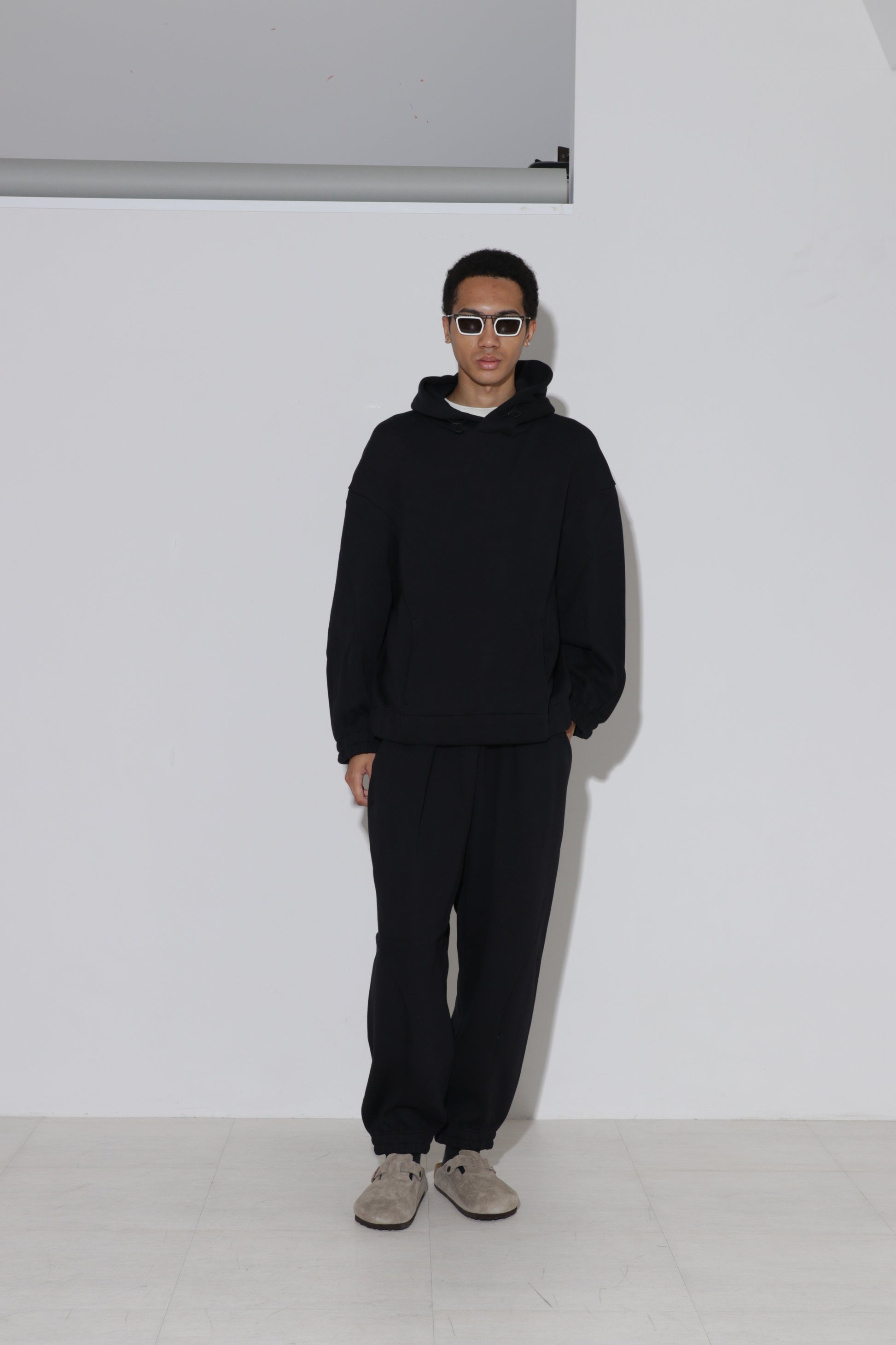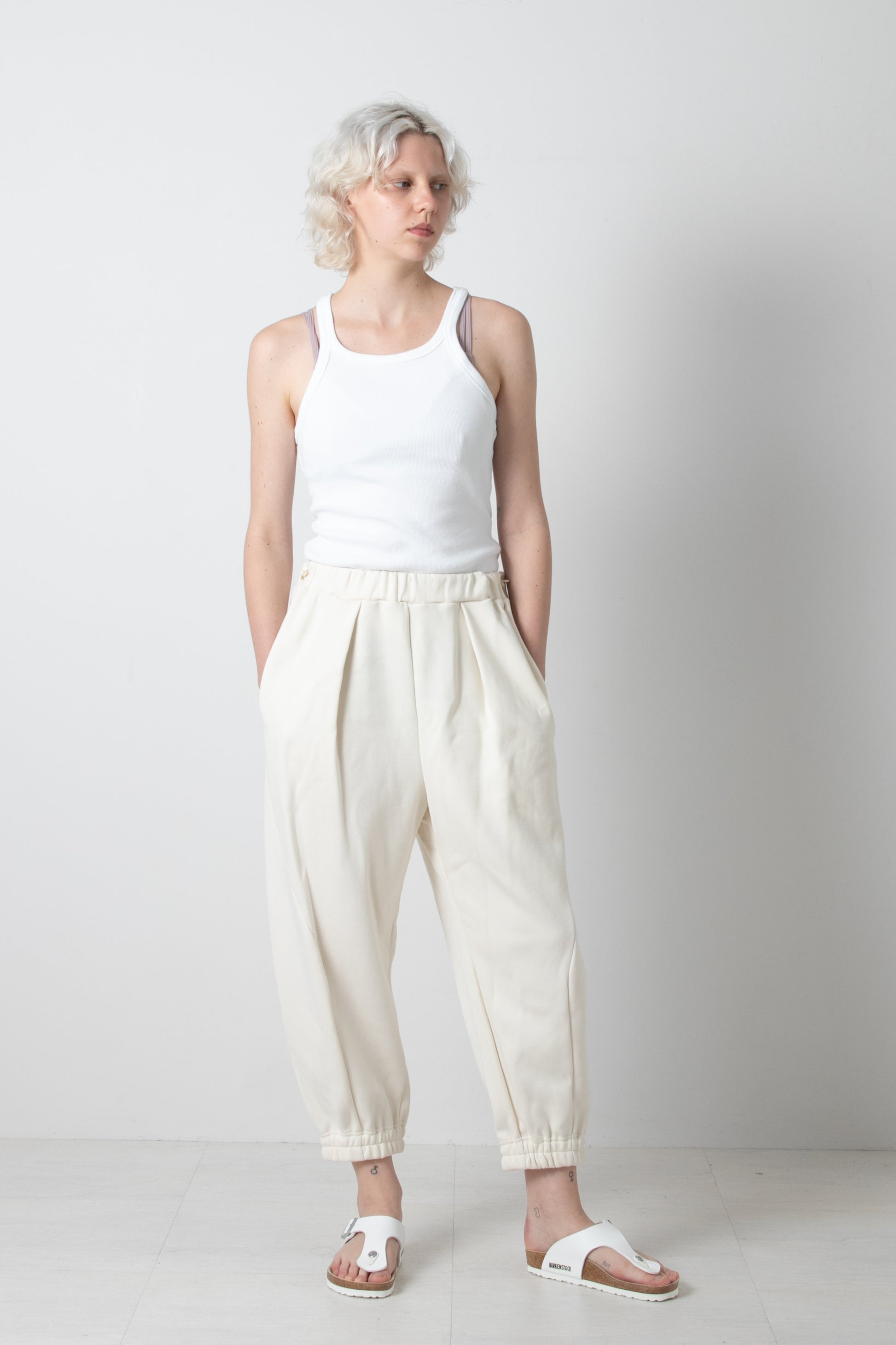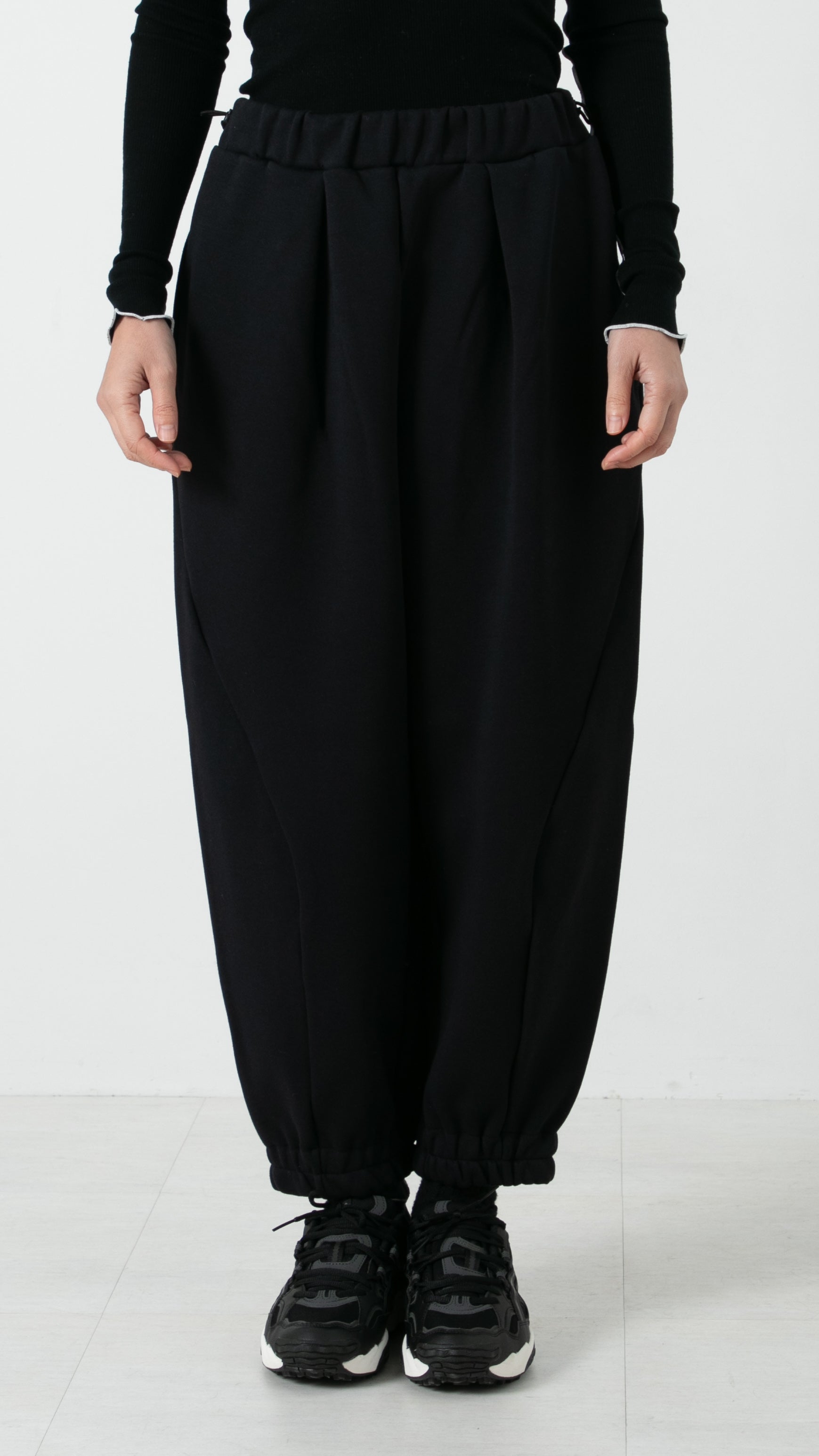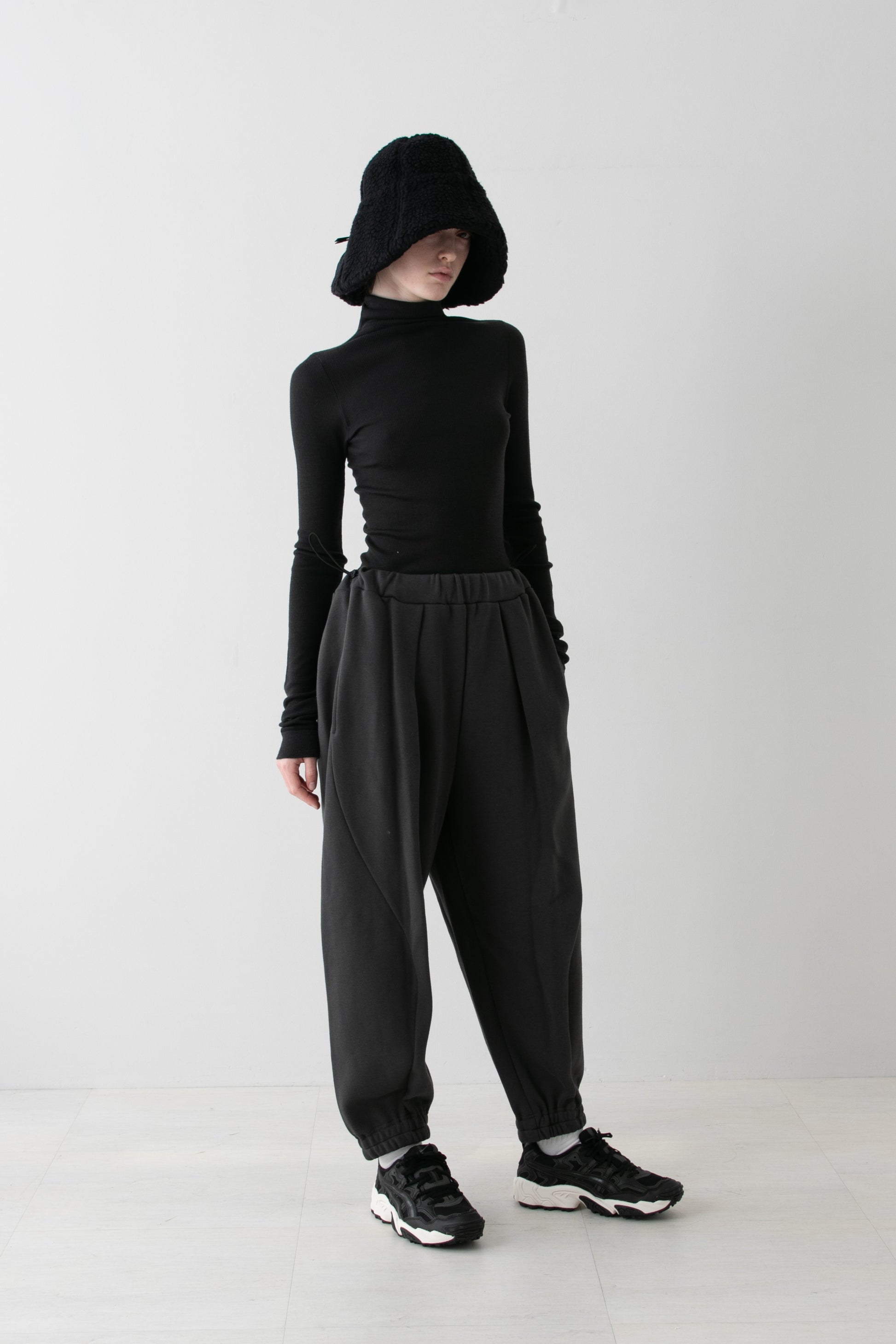 両サイドの切替え位置を大きく前にカーブさせる事で立体的なシルエットを構築しました。プレーンなスウェットパンツですが、存在感のあるアイテムとして着用頂けます。