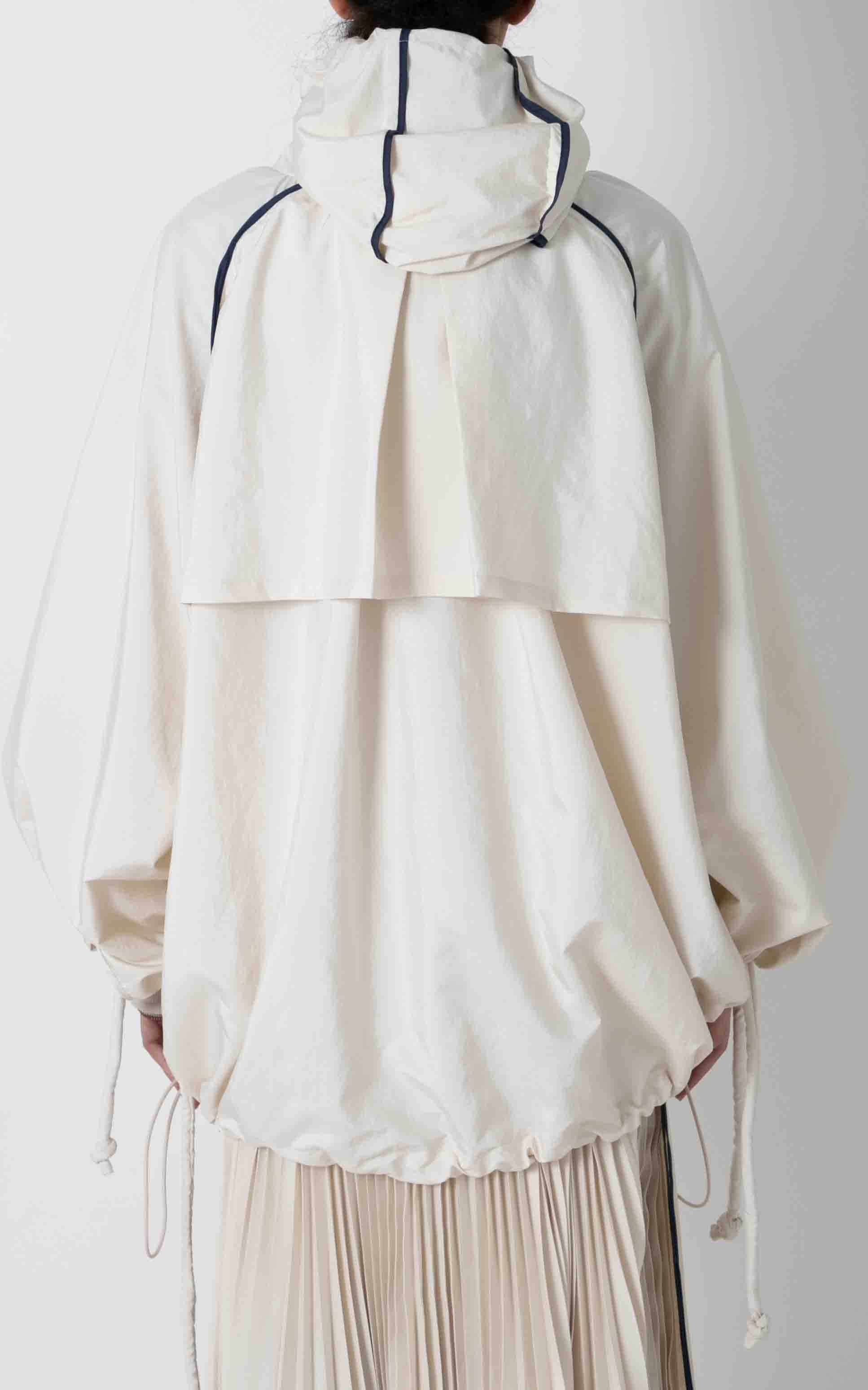 袖口には太いコードで絞れる様になっている他、ラグランスリーブ切替・身頃両サイド・フードに施されたパイピングがアクセントなっています。