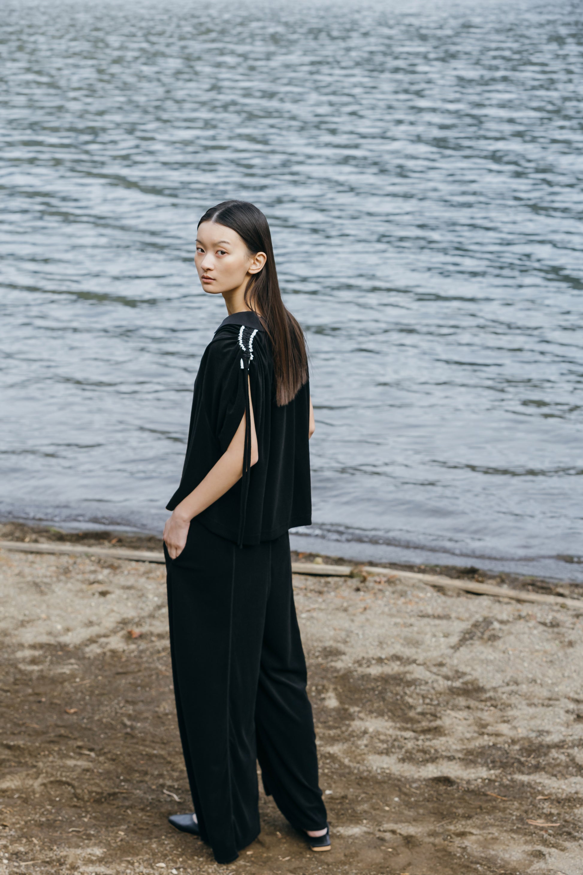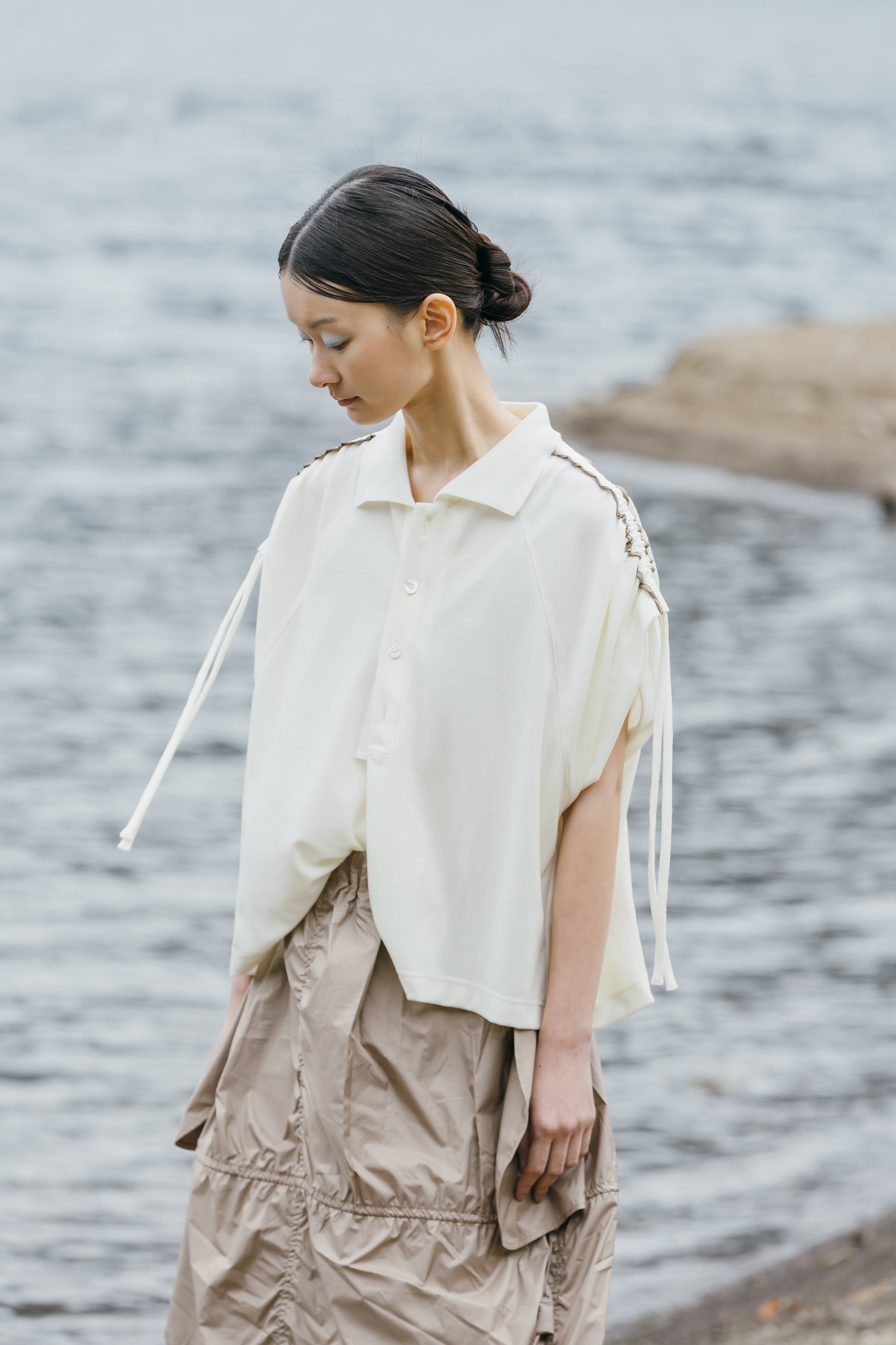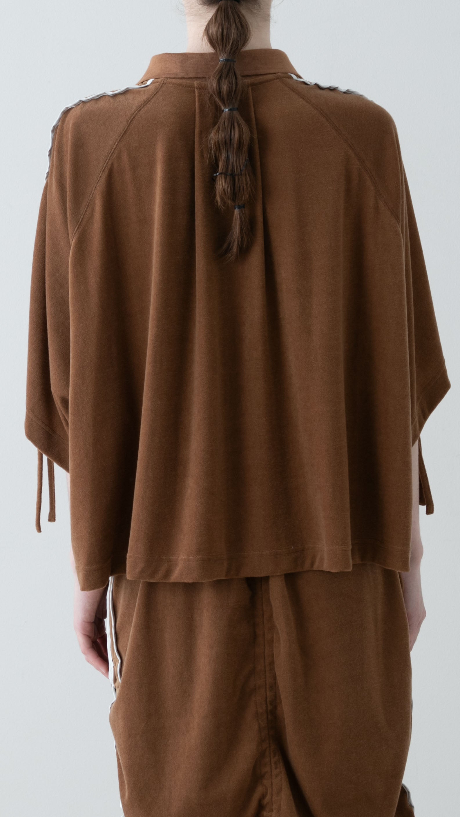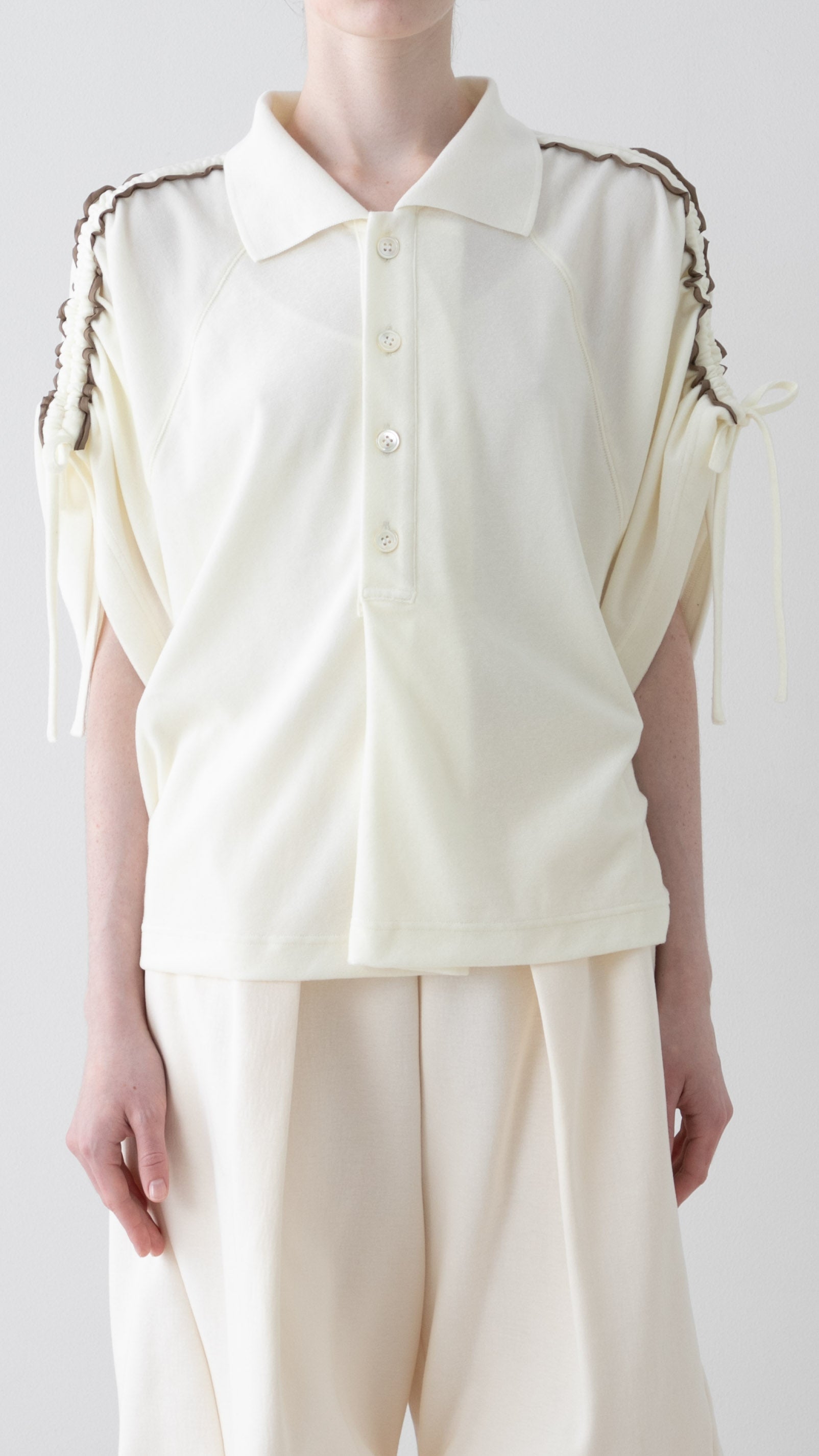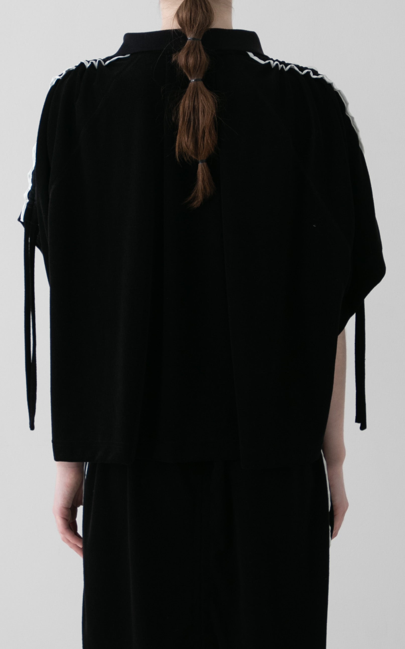 肩から袖山線にドローストリング用に共生地の紐が施されており、シルエットのみならず丈感を調整頂く事が出来ます。