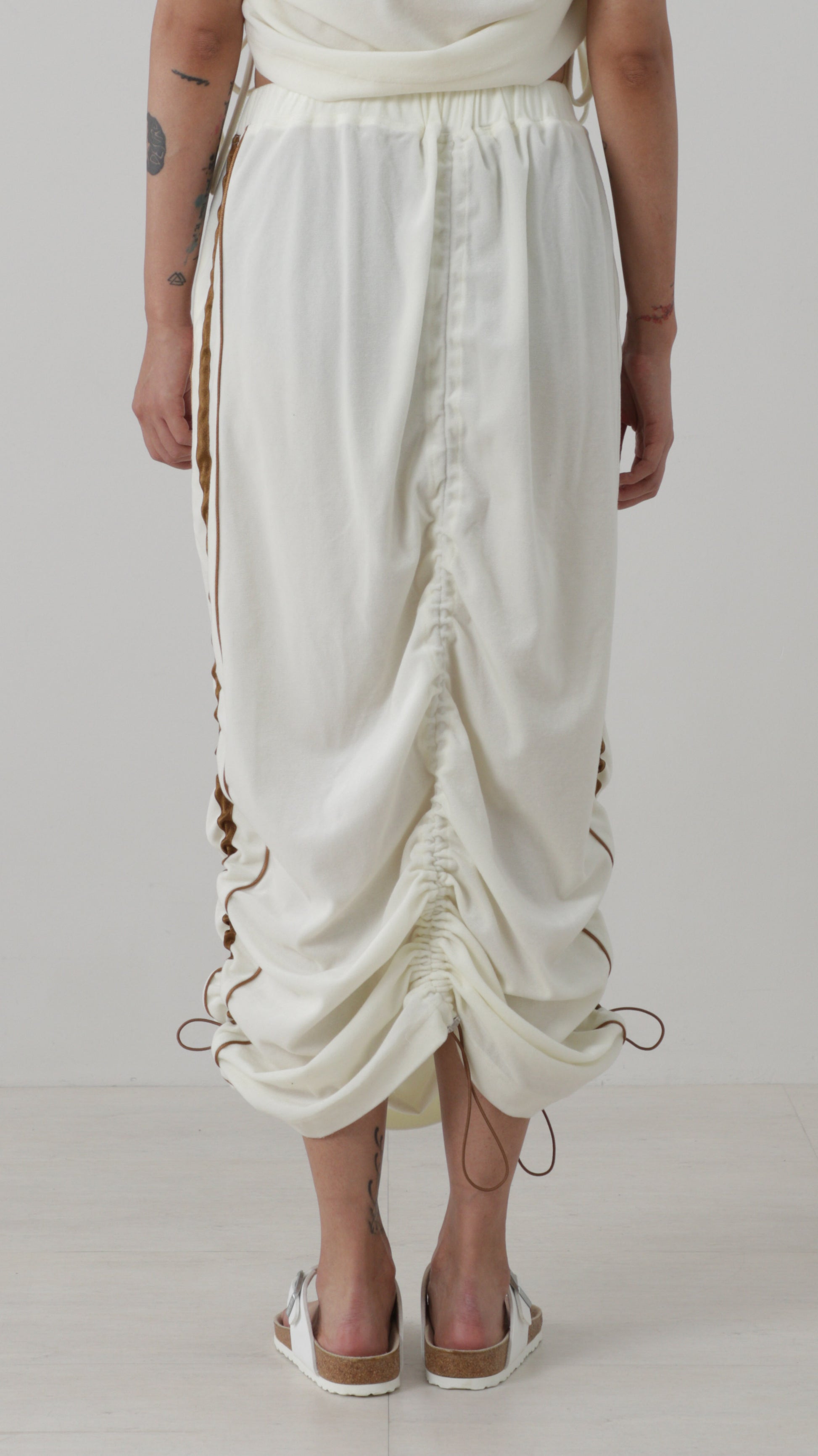 ポリエステルとリヨセルを混紡した、タオルのような風合いのパイル素材を使用したスカート。