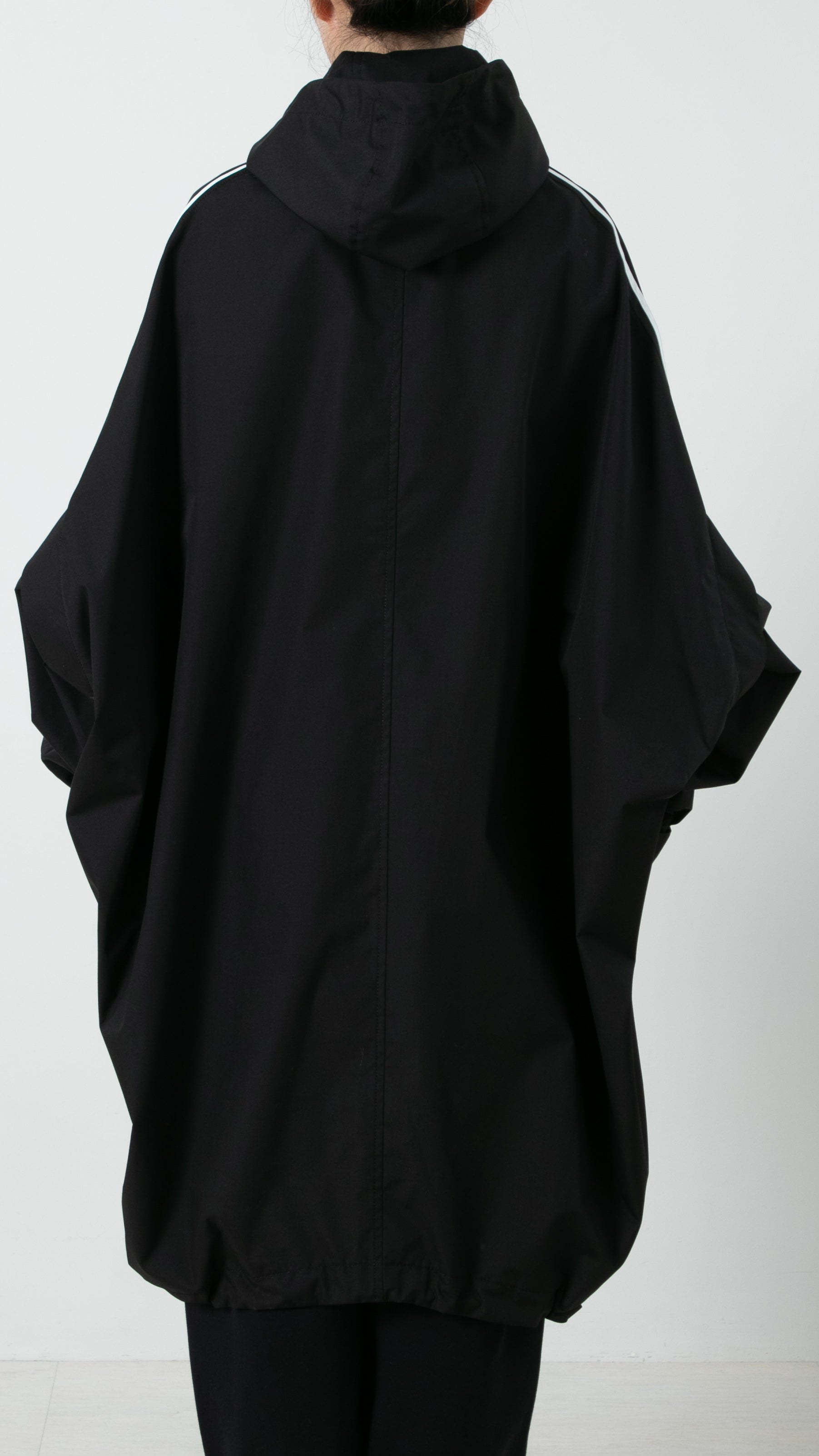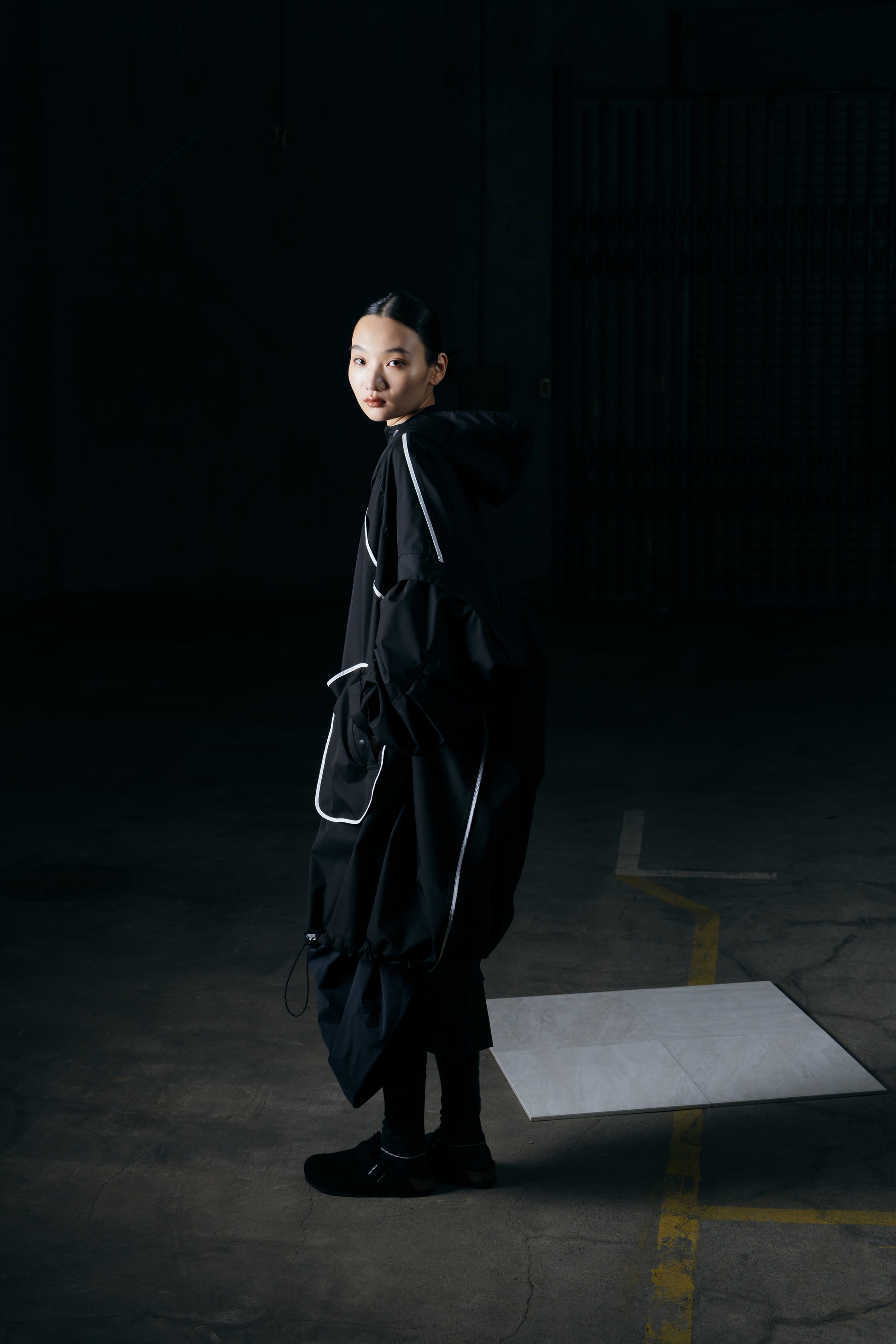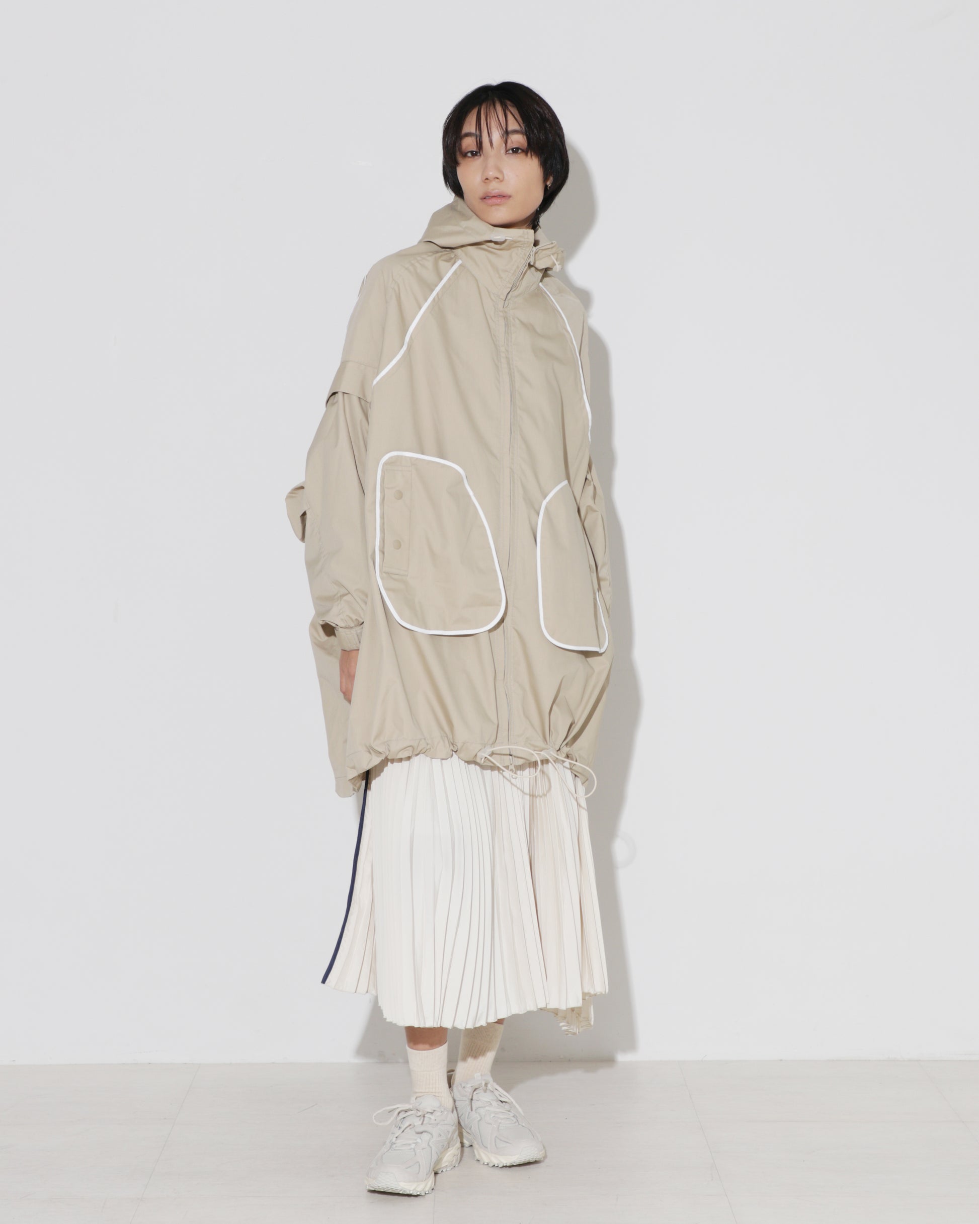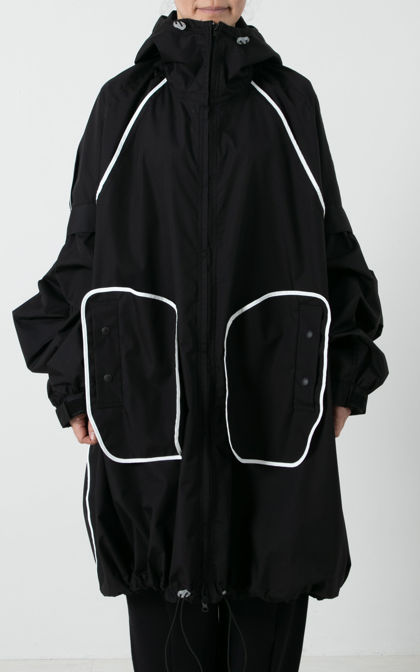 フードや裾にはドローコードが施されており、シルエットの変化、また防風の機能にもなっています。