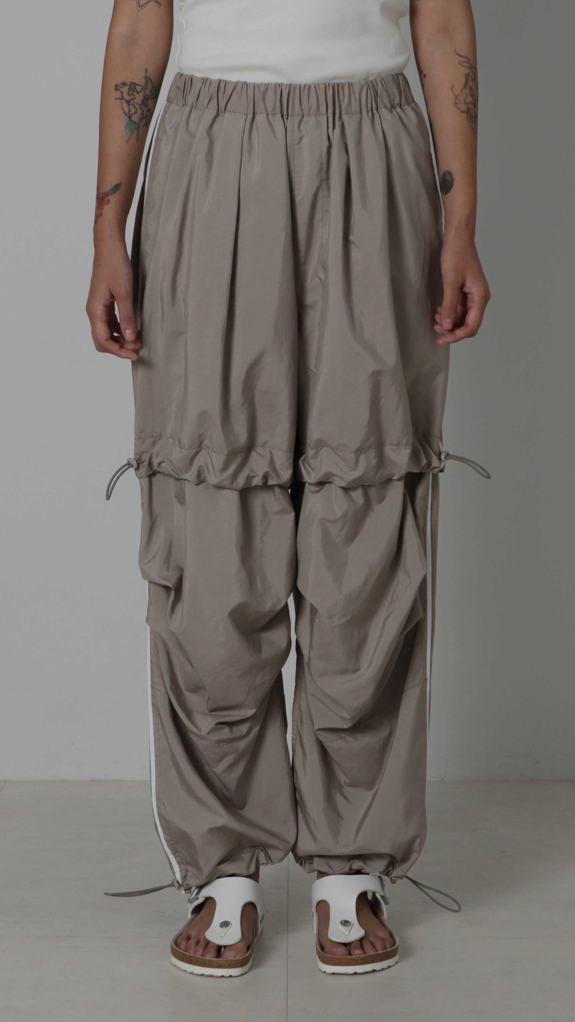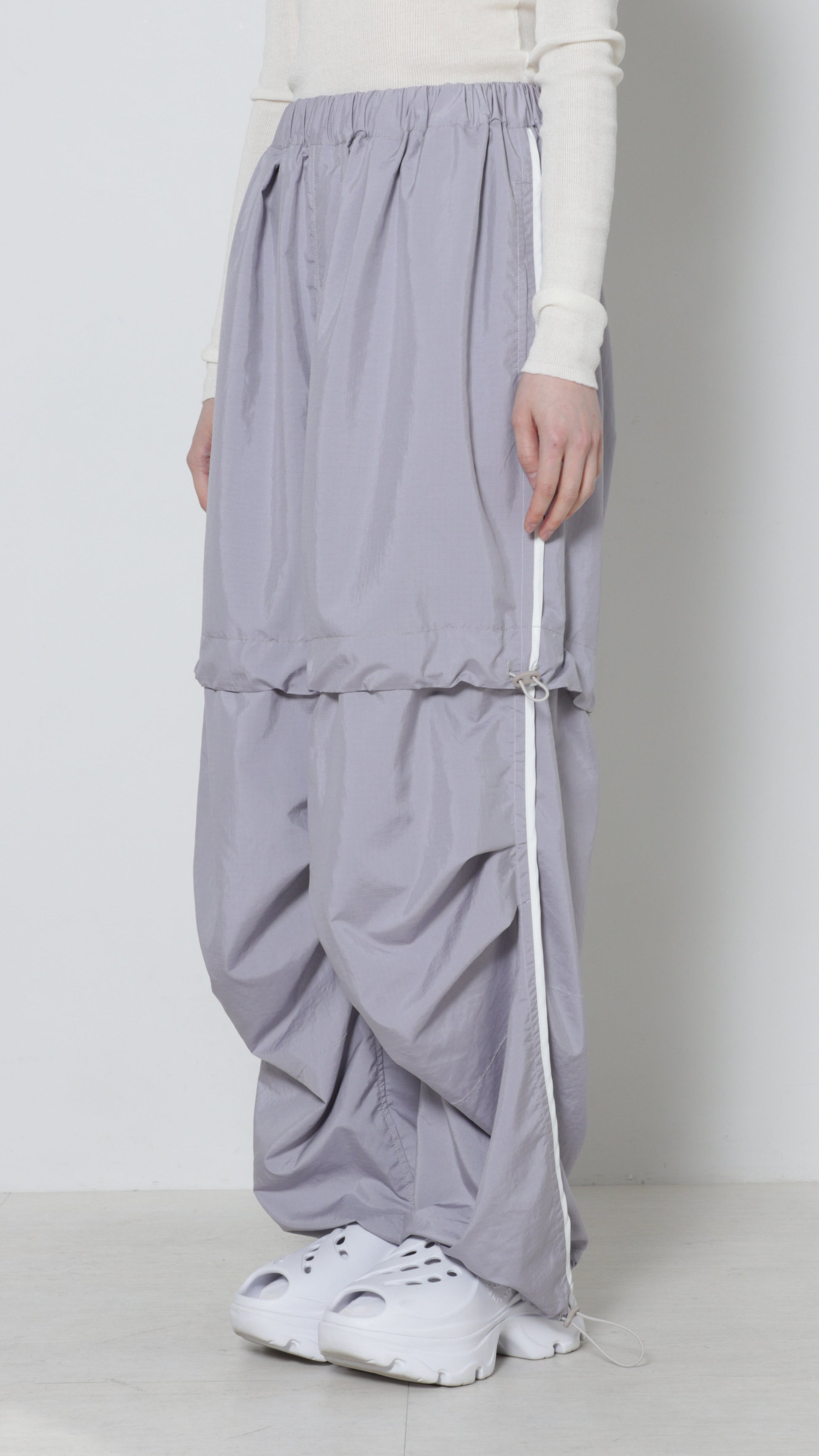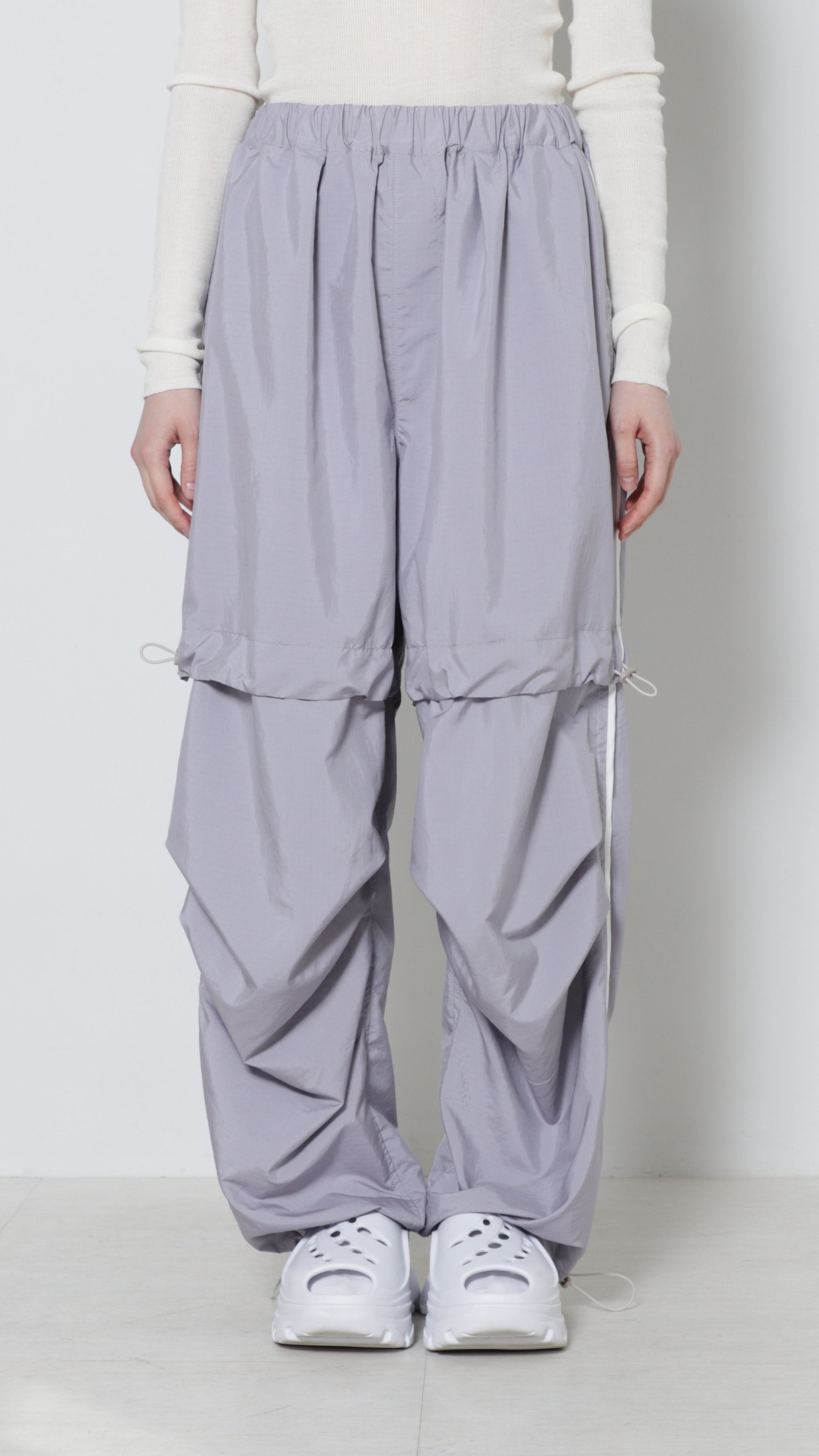 膝切替部分と裾にはコードゴムを施している為、絞る事でシルエットをスタイリングによって調整頂く事が出来ます。