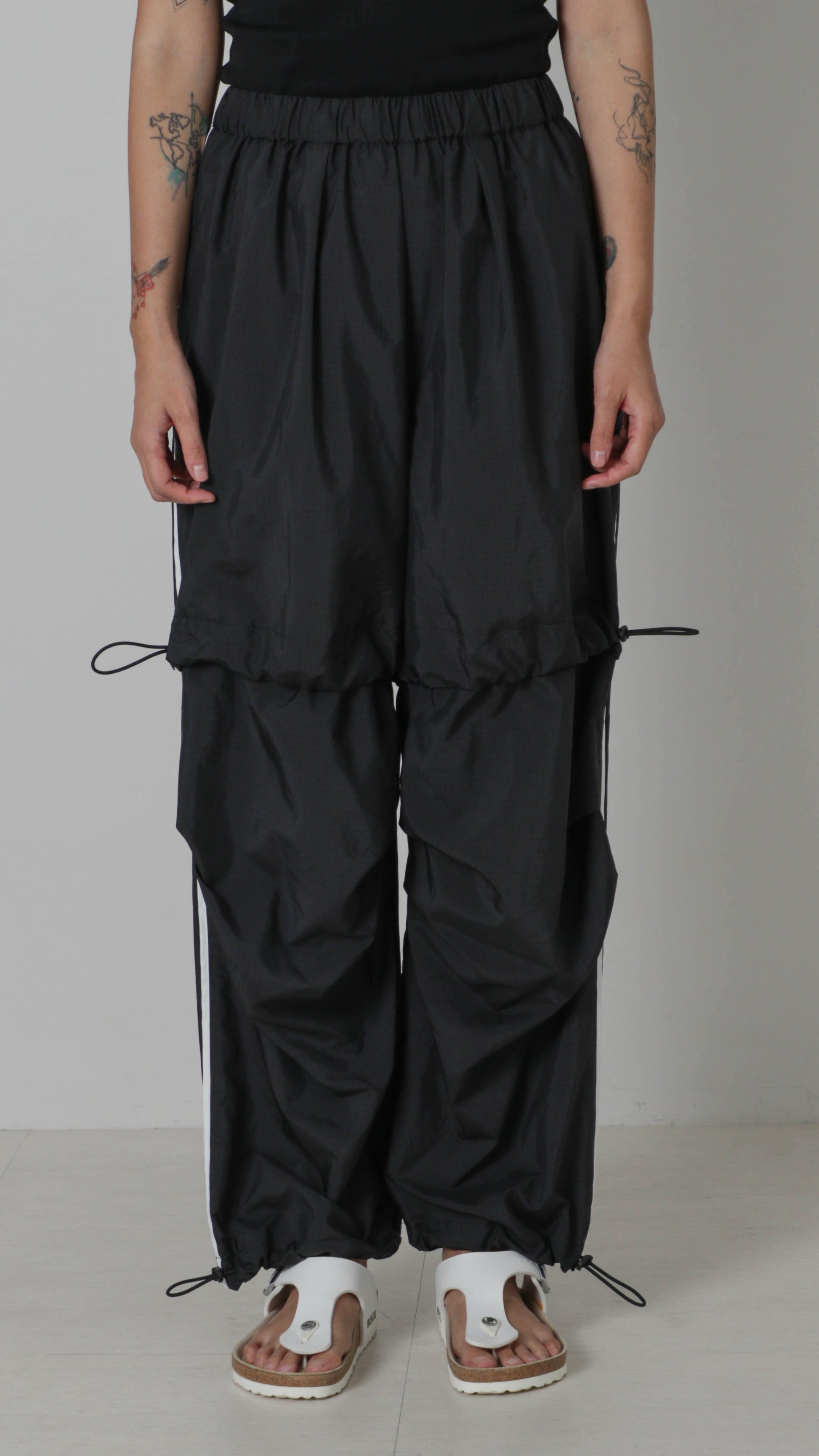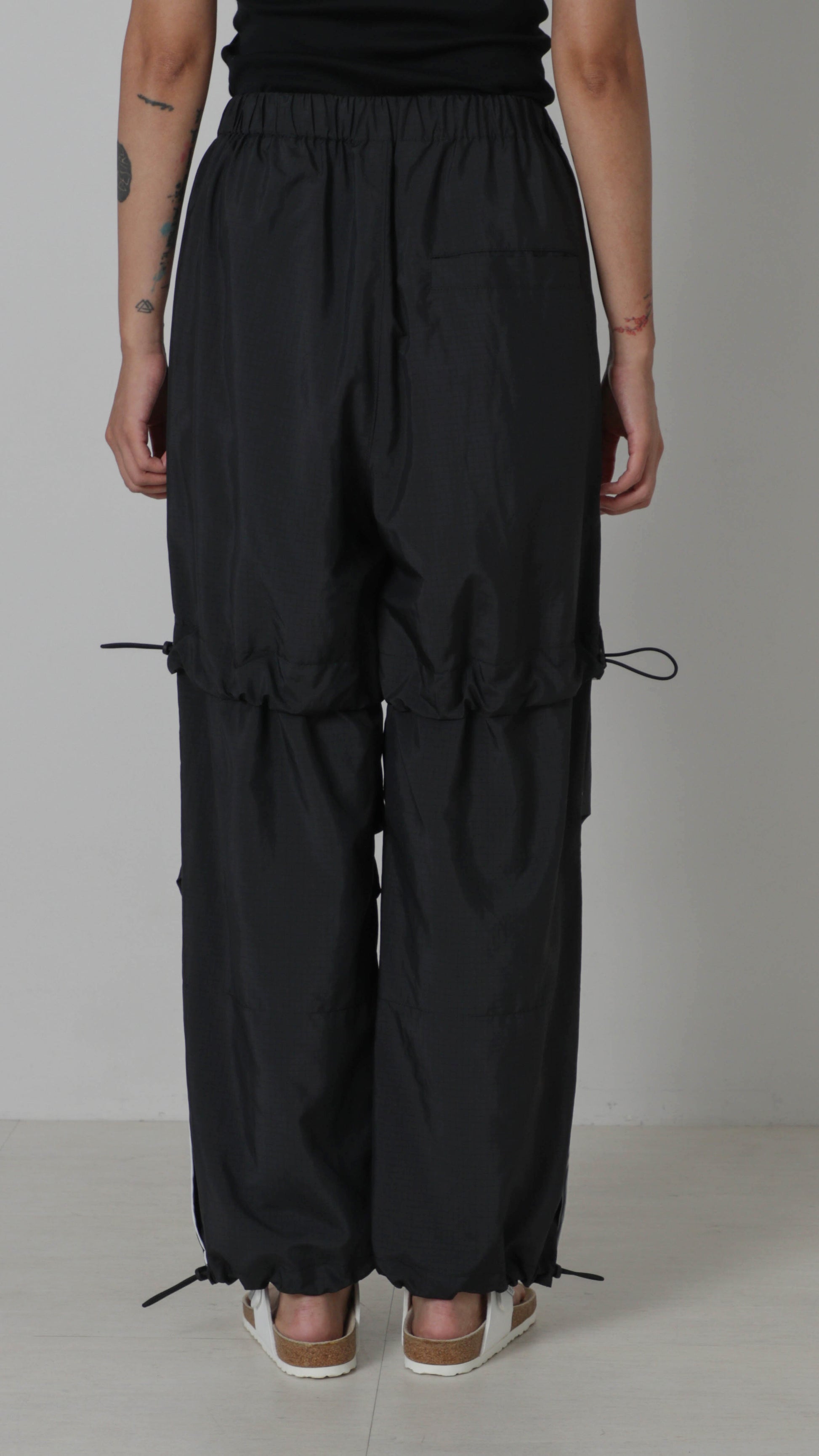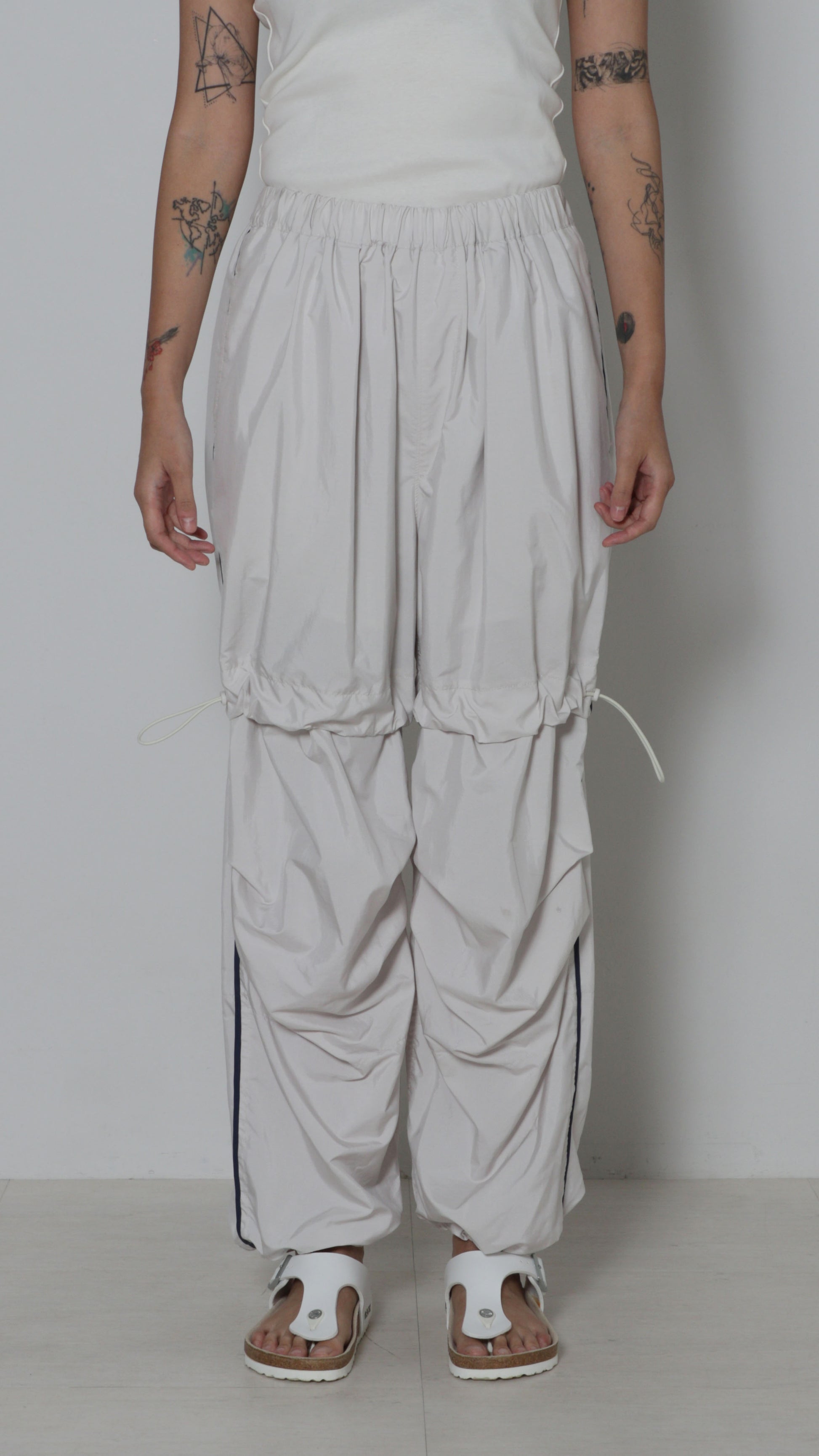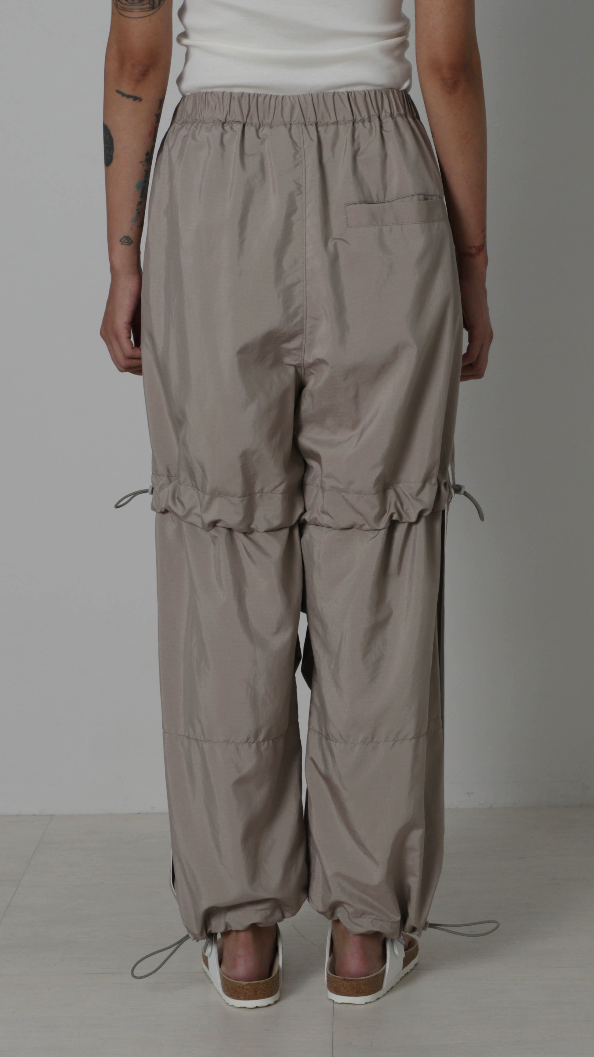 膝切替部分と裾にはコードゴムを施している為、絞る事でシルエットをスタイリングによって調整頂く事が出来ます。